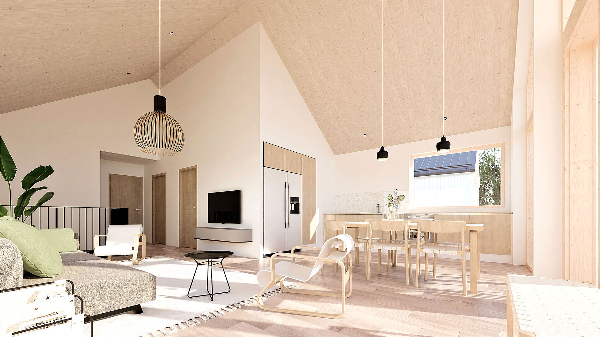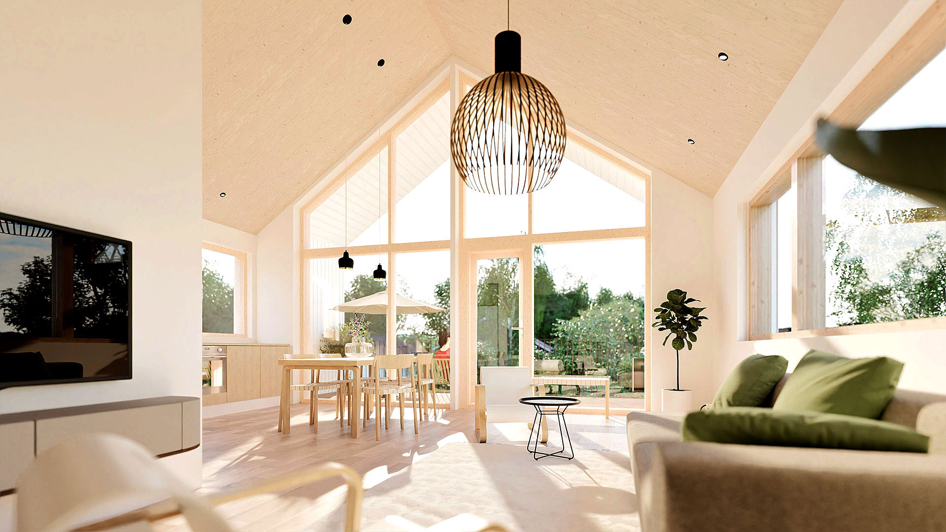Nykyaikainen design: Laadukkaat materiaalit, tyylikäs viimeistely, korotetut olohuoneet ja suuret ikkunat upealla niittynäkymällä