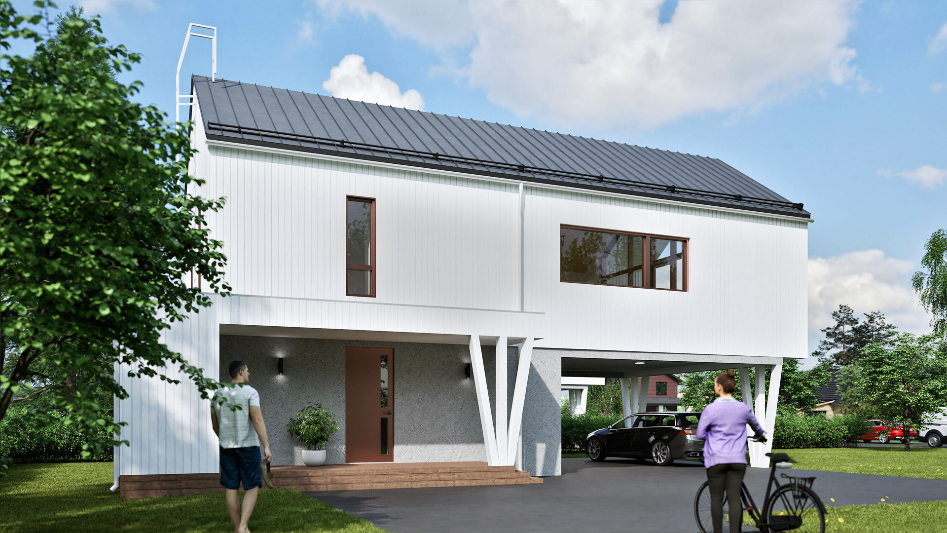 Sisäänkäynti, kodinhoitohuone ja saunatilat sijaitsevat pohjakerroksessa. Kaikki kolme makuuhuonetta ja olokeittiö on sijoitettu yläkertaan. Olokeittiön korkea katto, isot ikkunat ja suuri lasiseinä tuovat tilaan paljon valoa ja avaruutta. Lasiseinän kautta avautuu käynti tilavalle parvekkeelle. Kahden auton autokatos ja katoksen yhteydessä oleva lämmin varasto tuovat lisämukavuutta asumiseen.