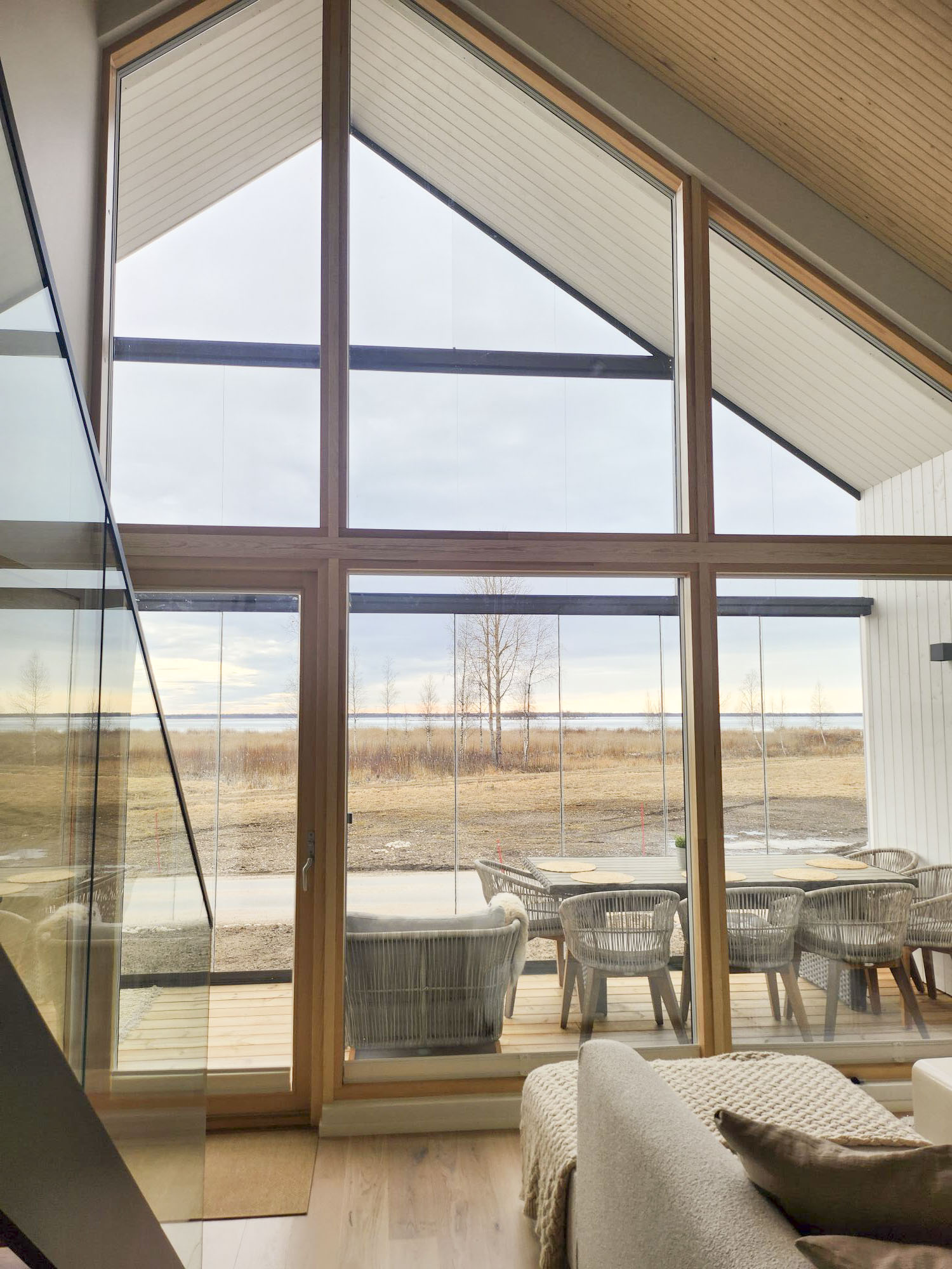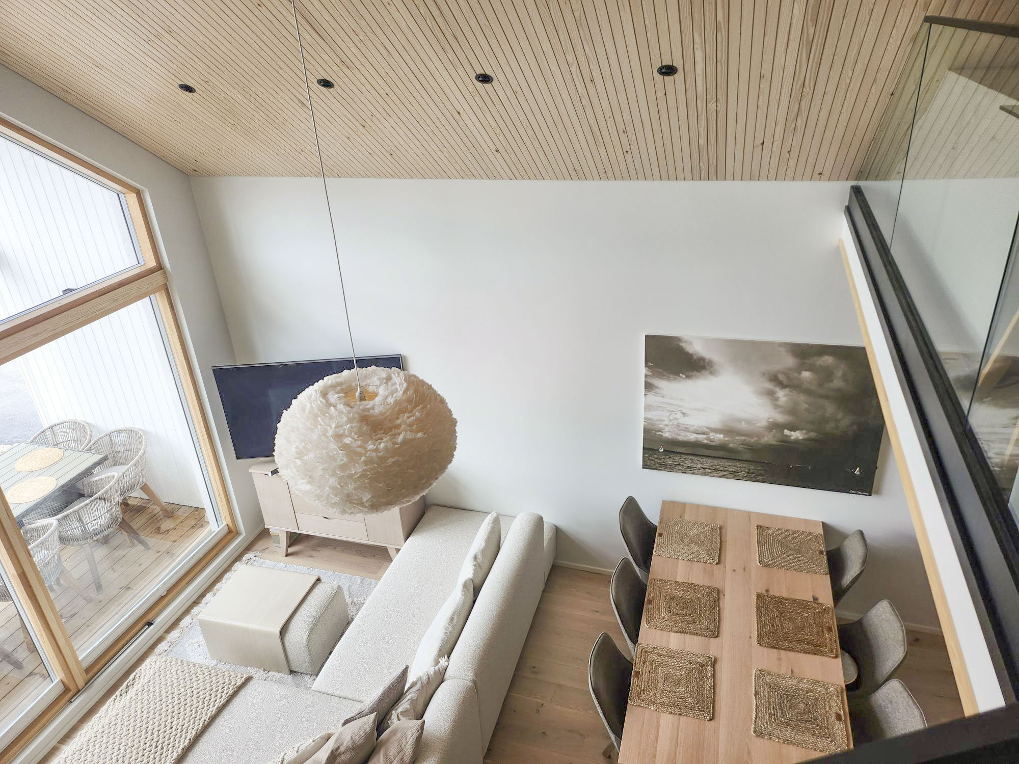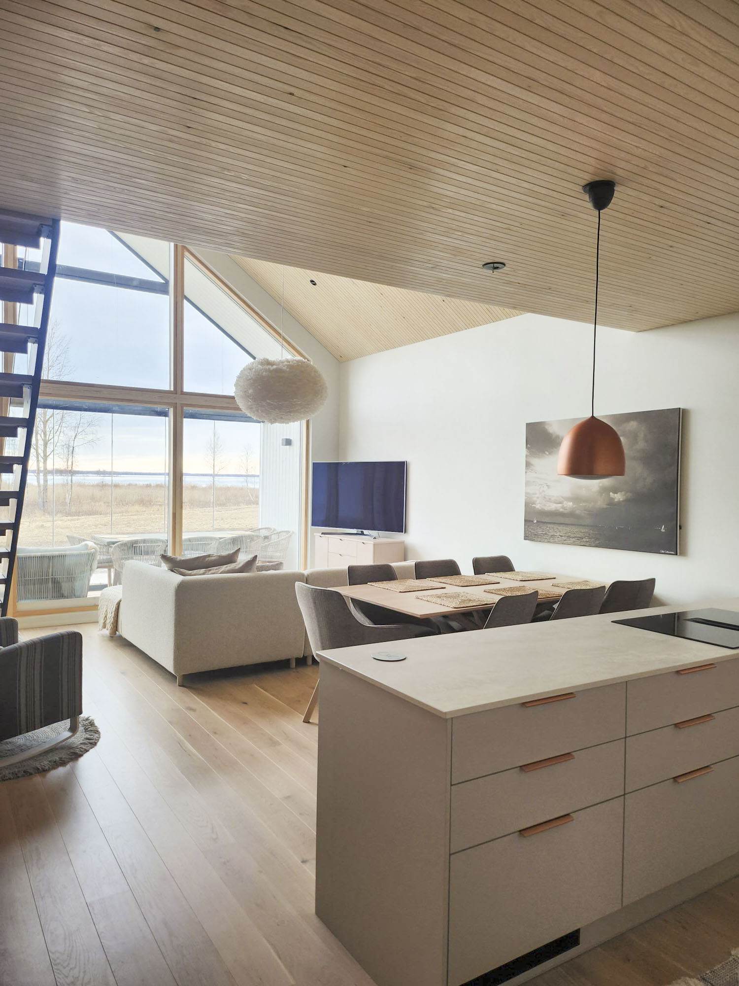 Ylellisessä olohuoneessa on monen monta ihastuttavaa yksityiskohtaa. Rimapaneelikatto ja portaikko ovat linjakkaita sisustuselementtejä, merinäkymät ovat tyrmäävän kauniit ja avoin yhteys Puustellin seurustelukeittiöön ja ruokailutilaan tekevät kokonaisuudesta äärimmäisen kutsuvan.