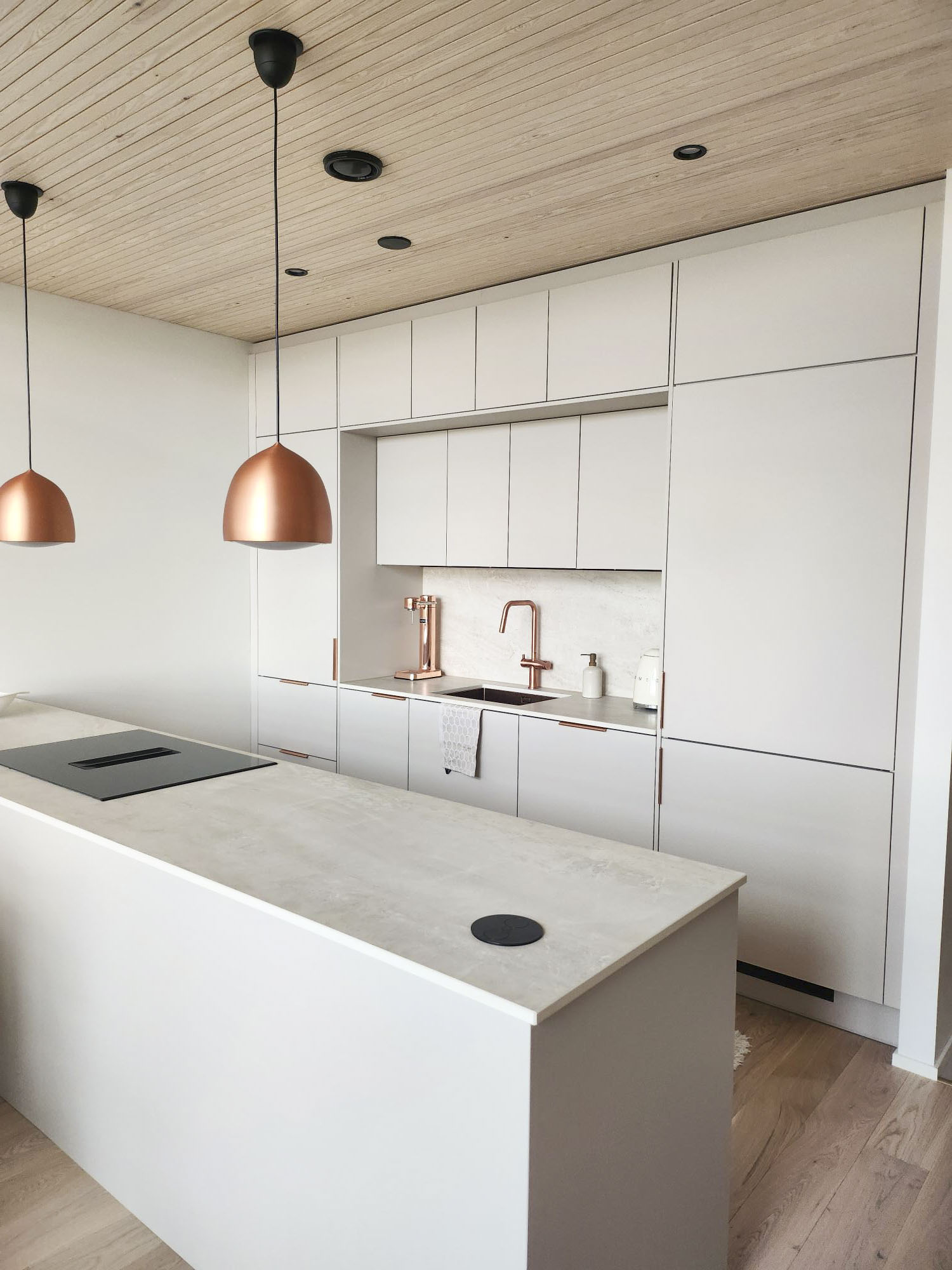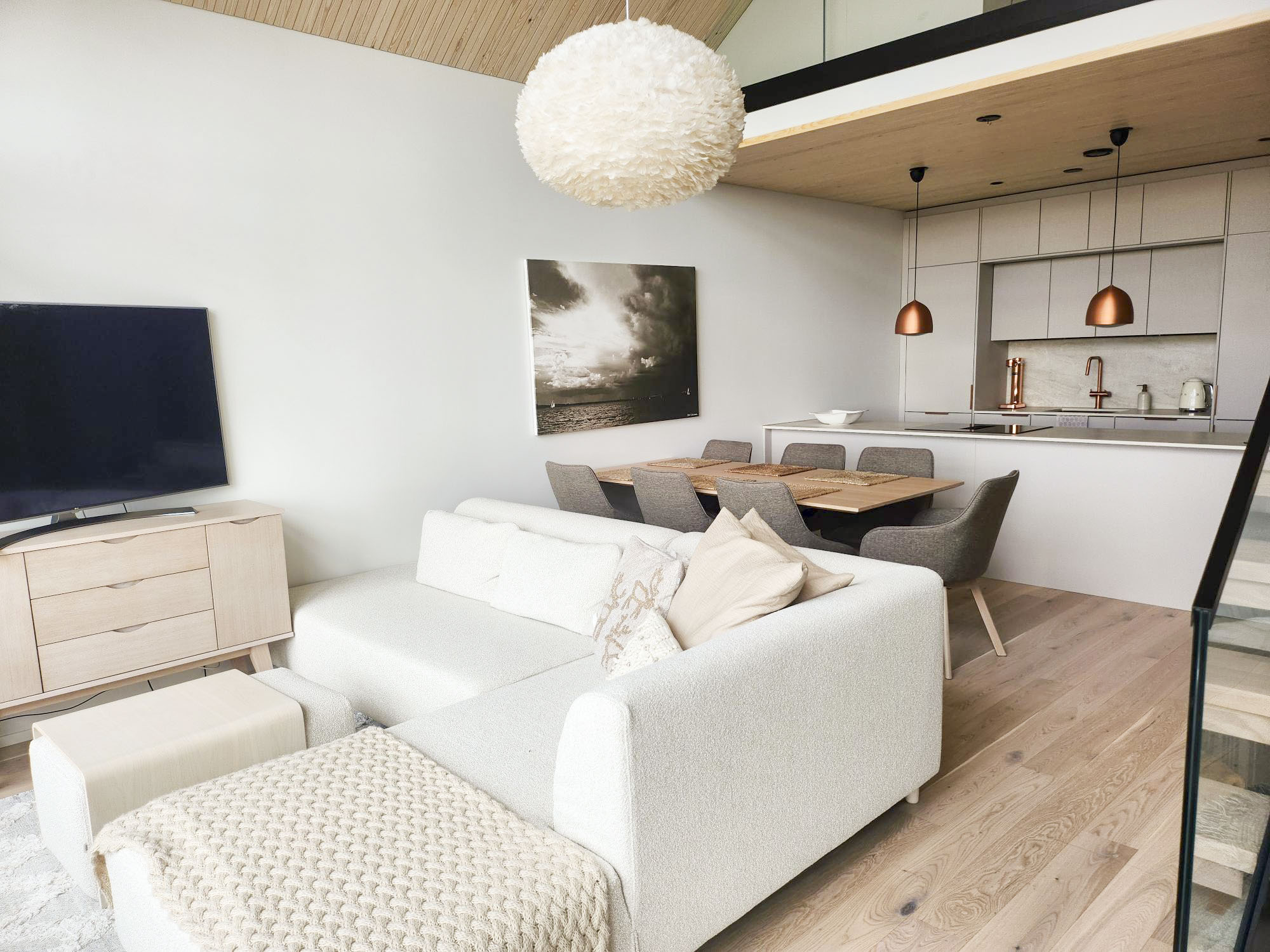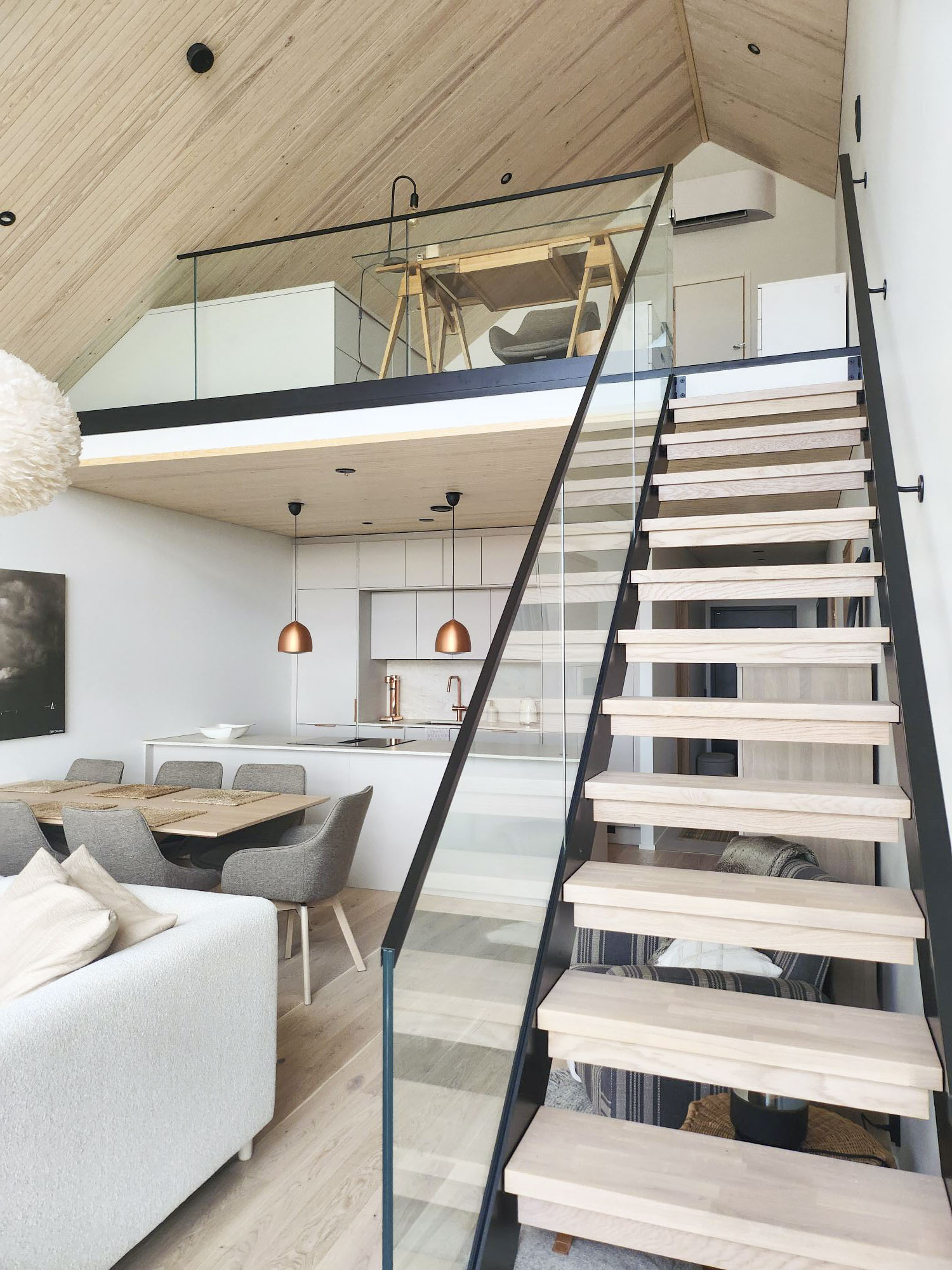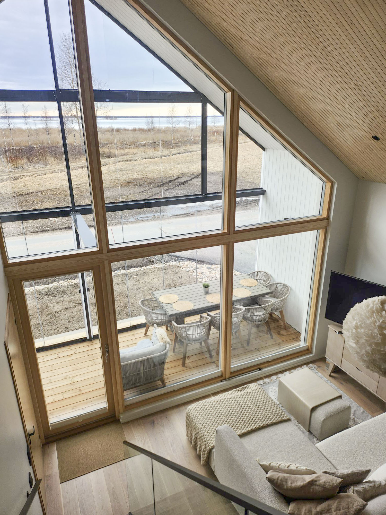 Olohuone-keittiötä hallitsee suuret koko seinän kokoiset ikkunat mistä avautuu näkymä merelle päin sekä pääsy katetulle terassille. Myös korkea huonekorkeus tuo avaruuttaa tilaan. Jokaisessa kodissa on sisäänkäynnin yhteydessä autokatos ja varasto.
