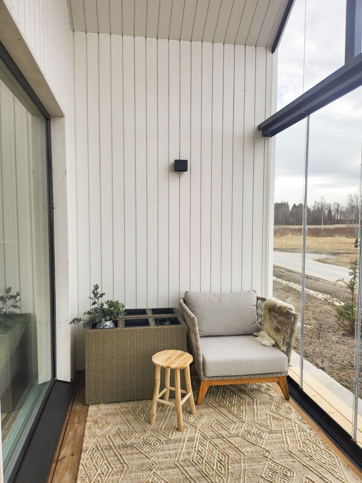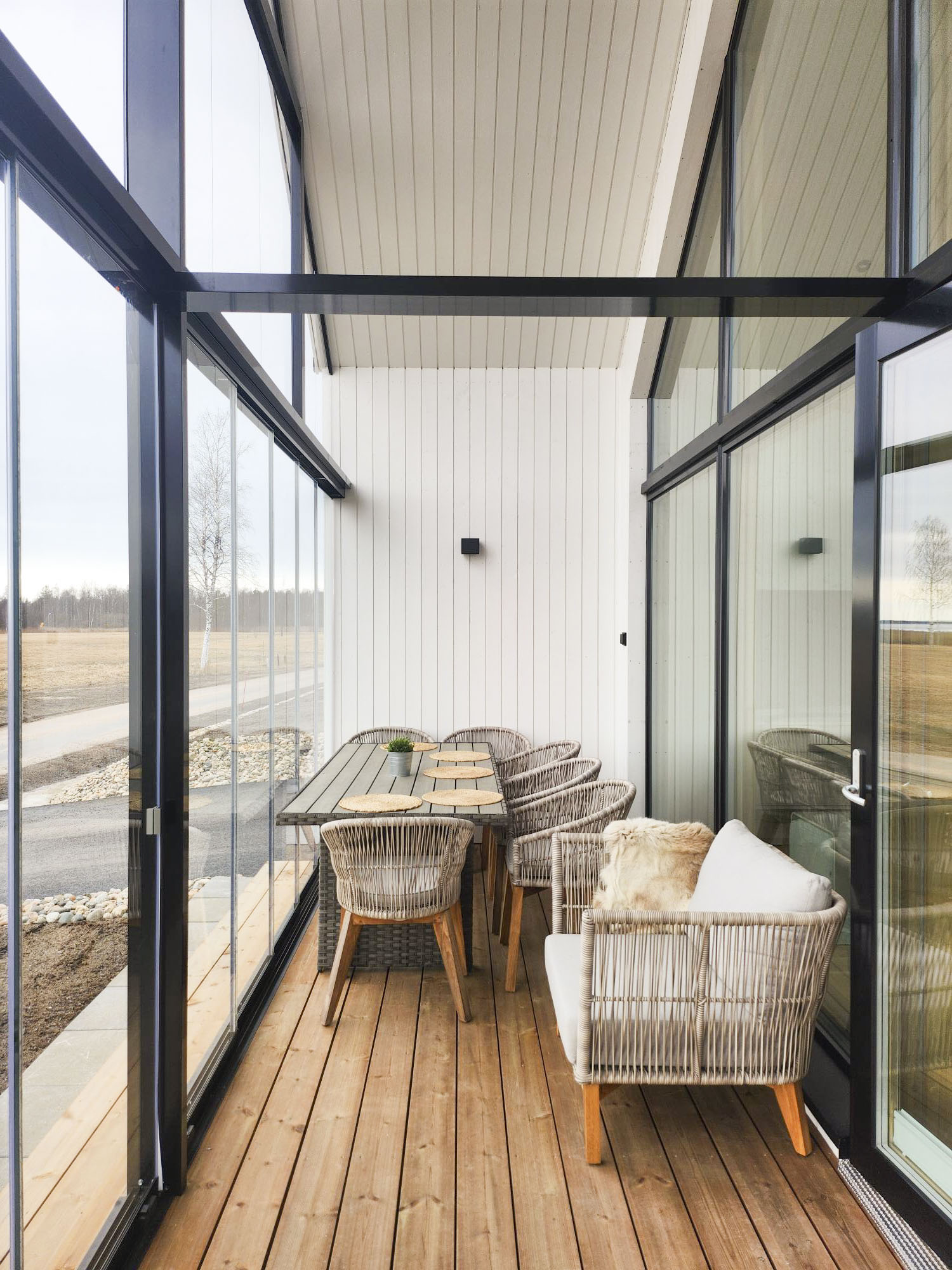 Ulkotilat ovat ihastuttavat! Upealla lasitetulla terassilla voi nauttia ihanasta merimaisemasta sateissallakin säällä. Siellä on myös ulkoporeallasvaraus. Mikä olisikaan ihanampaa kuin nauttia tästä maisemasta rentouttavassa porealtaassa lekotellen. Tilaa on myös hienosti ruokailuryhmälle. Kodeissa on lisäksi avoin terassiosuus olohuoneen edustalla, johon voi halutessaan asennuttaa avattavan lasituksen.